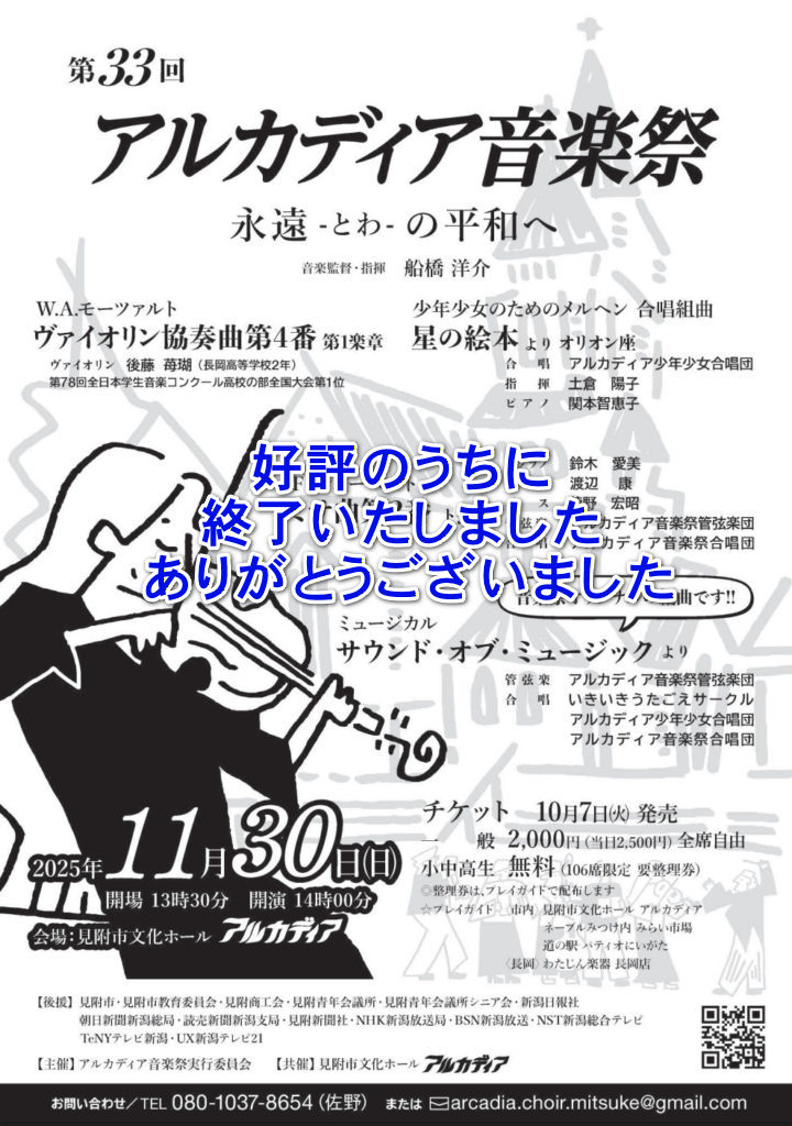 アルカディア音楽祭合唱団 '93 年見附市文化ホールの開館記念事業の『第1回アルカディア音楽祭」で結成され、'96 年「アルカディア混声合唱団」として発足。'05 年、同合唱団を母体とする「アルカディア音楽祭合唱団」が結成され、年末恒例の「...